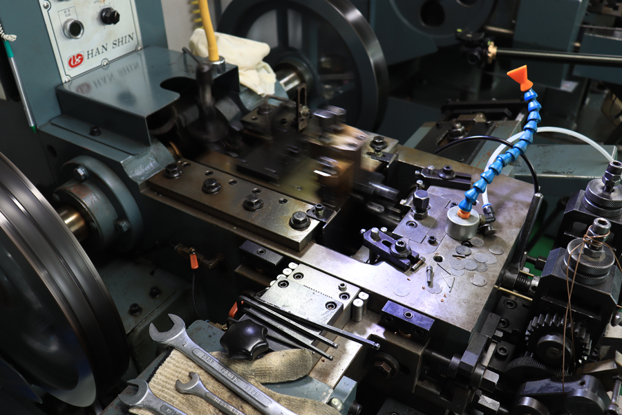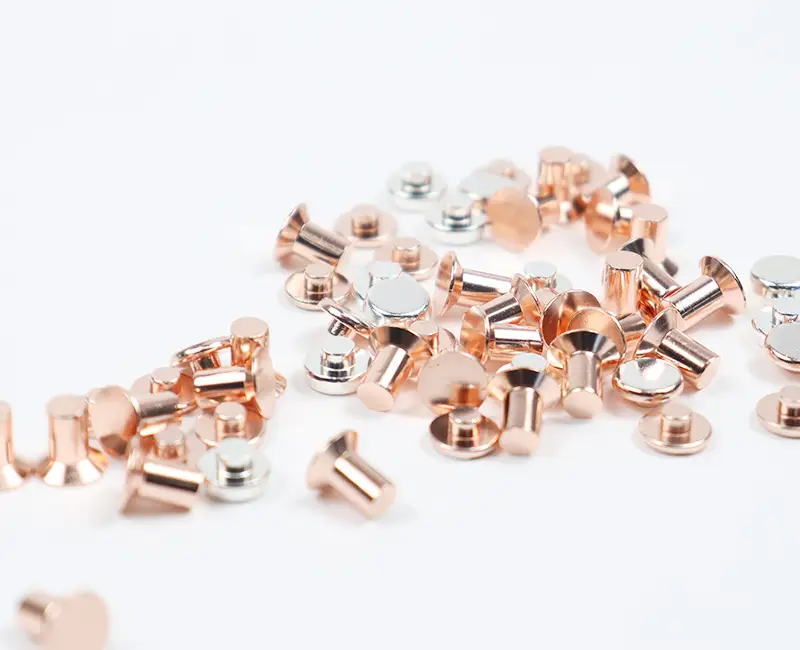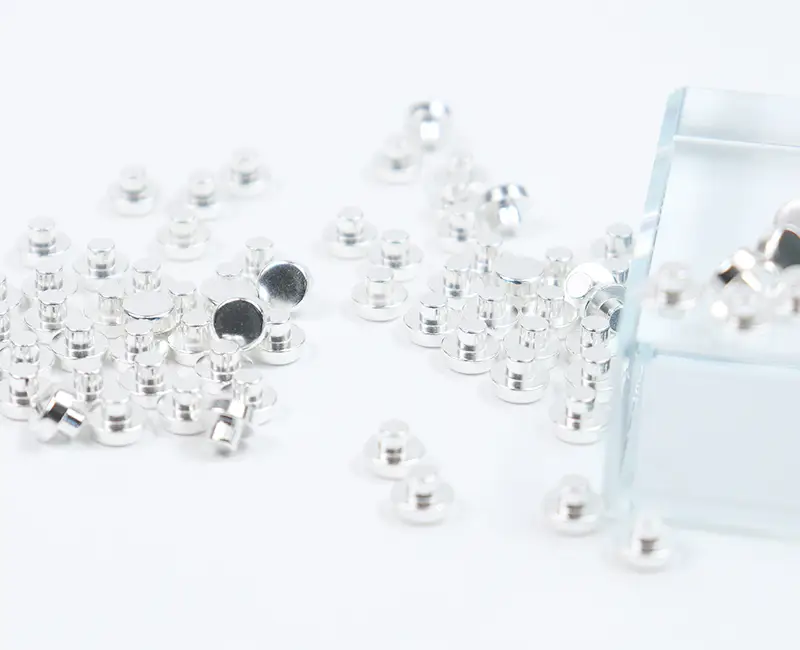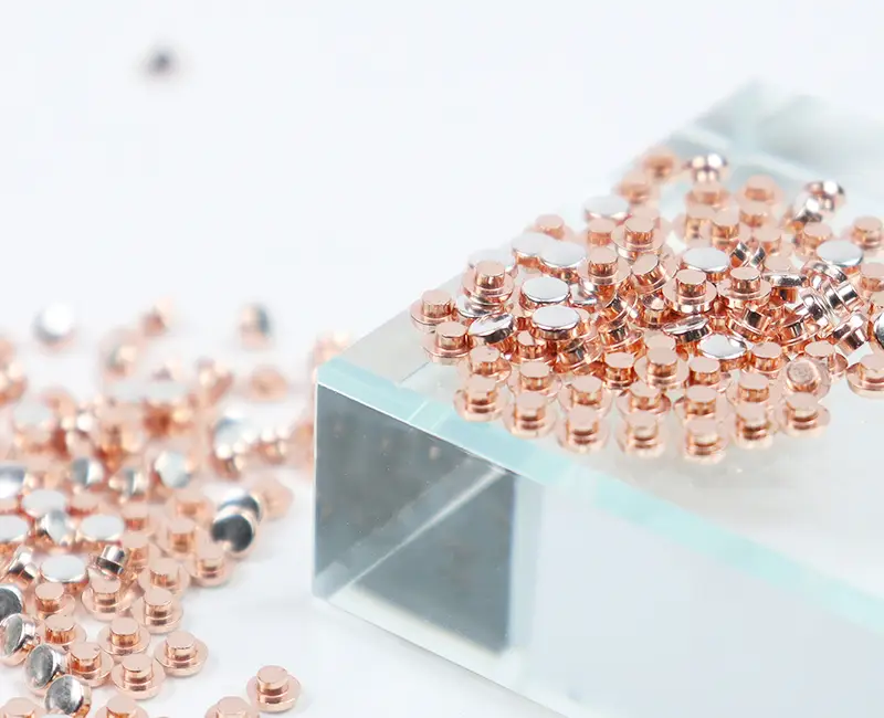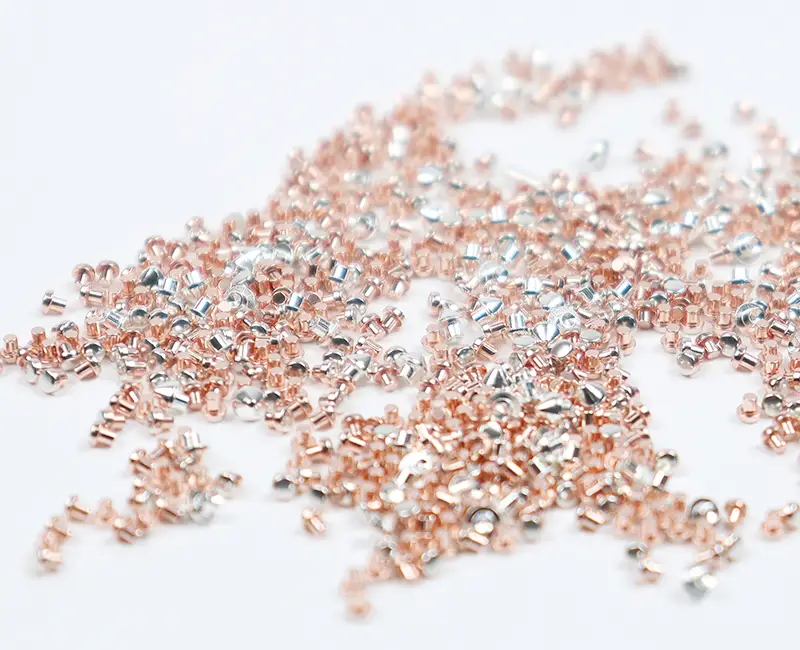 전기 접점은 은(Ag), 은합금, 구리(Cu) 등의 와이어(선재) 형태로 공급된 재료를 절단하여 제작할 수 있습니다. 일정한 직경의 와이어를 정밀 커팅(Cutting) 장비로 절단하면 균일한 길이의 접점 피스가 얻어지며, 이후 냉간 압축(Cold Heading) 또는 프레스 가공으로 접점의 형상(원형, 리벳형 등)을 형성합니다. 절단 후에는 리벳팅, 브레이징, 저항 용접 등의 접합 공정을 통해 기재(Base)에 부착됩니다. 마지막으로 도금, 연마, 열처리 등을 거쳐 표면 특성을 안정화해 신뢰성을 확보합니다